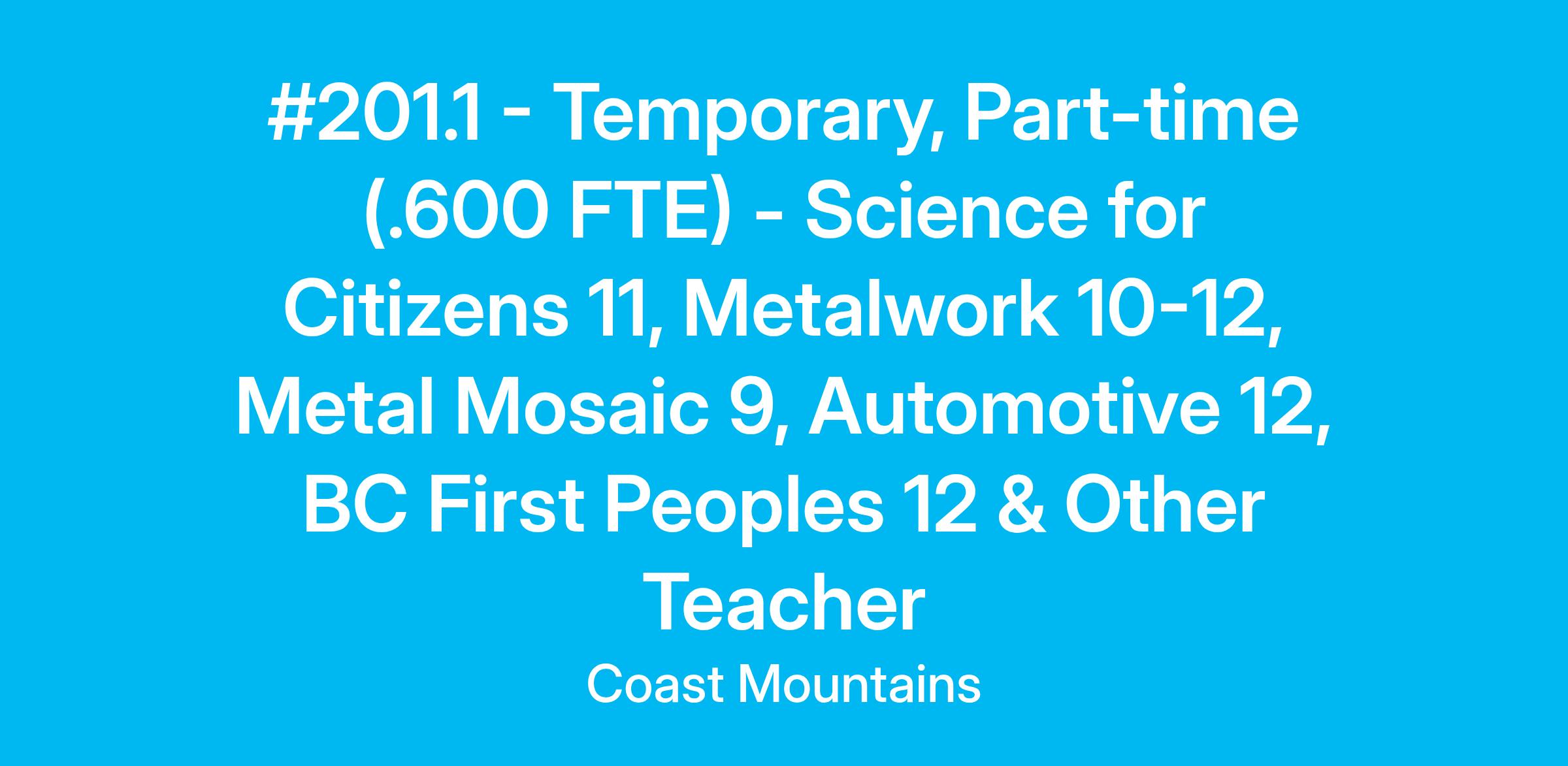 Position - Temporary, part-time (.600 FTE) - Science for Citizens 11, Metalwork 10-12, Metal Mosaic 9, Automotive 12, BC First Peoples 12 & Other Teacher