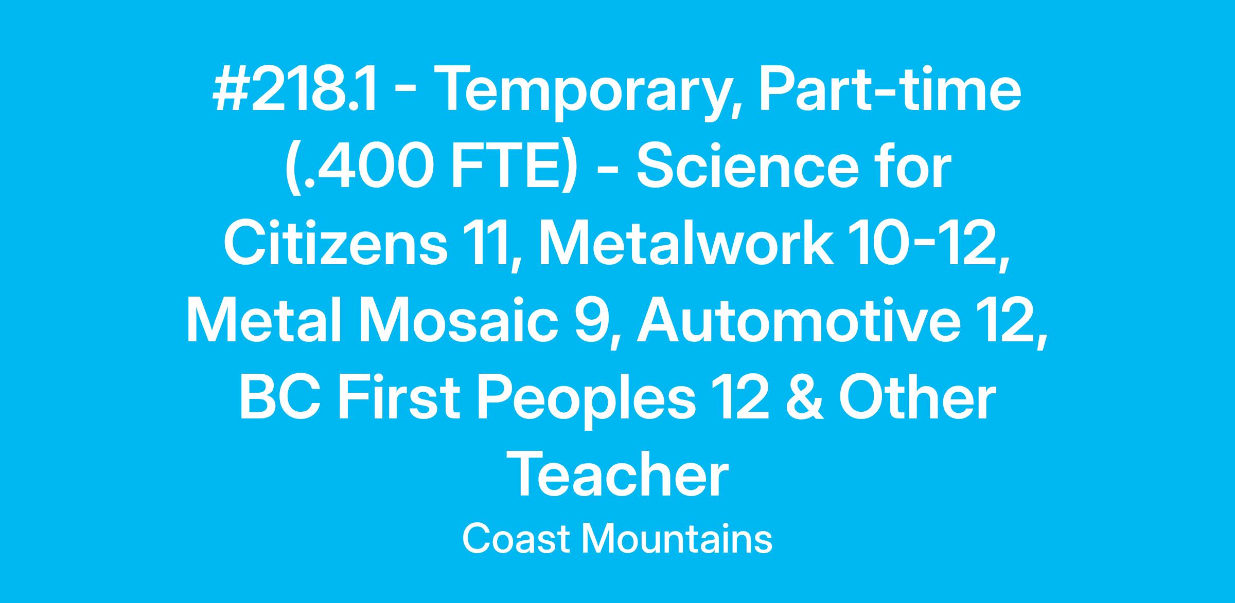 Position - Temporary, part-time (.400 FTE) - Science for Citizens 11, Metalwork 10-12, Metal Mosaic 9, Automotive 12, BC First Peoples 12 & Other Teacher