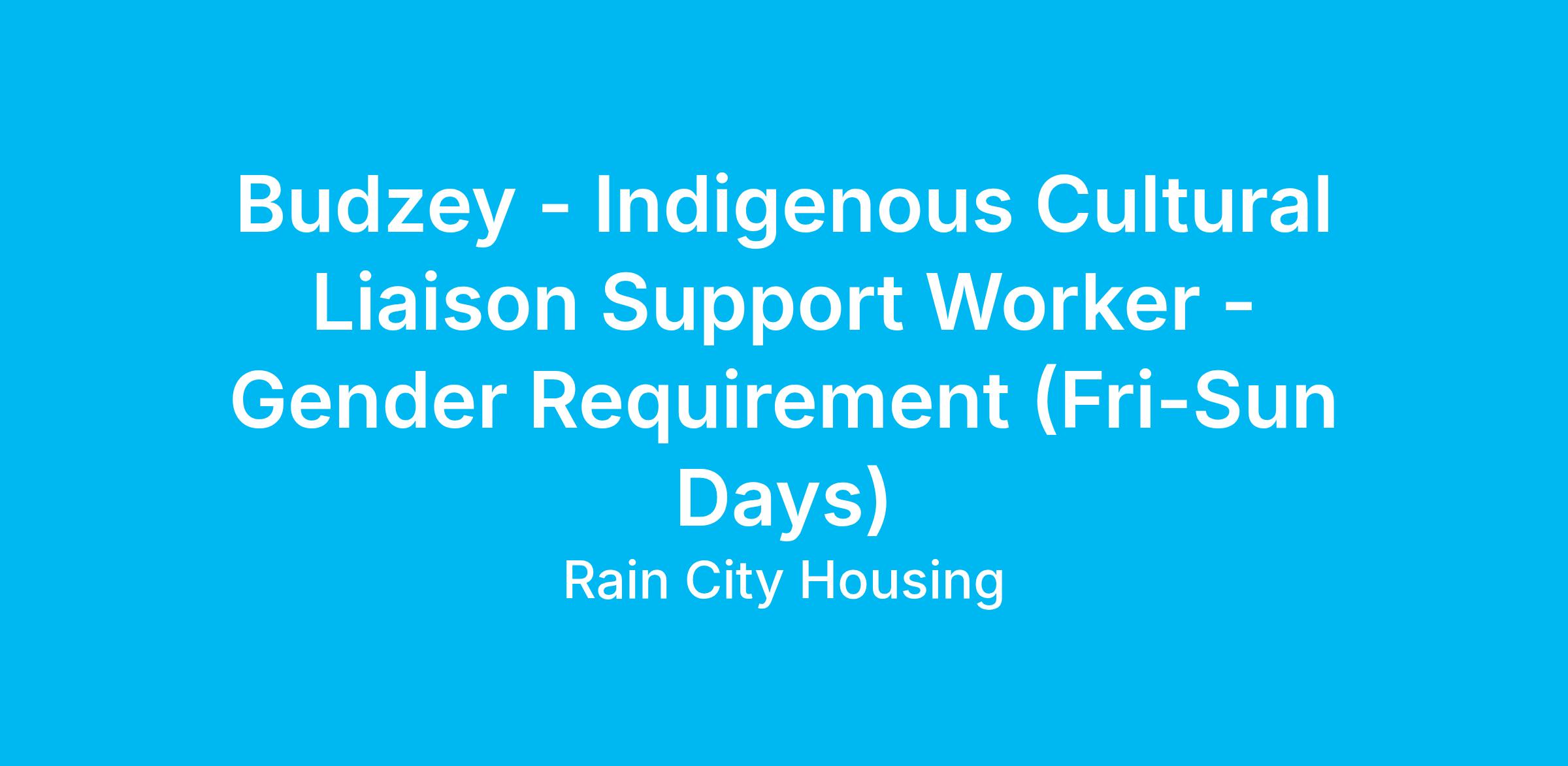 Job Competition # Job2025.365 Closing Date: midnight February 13, 2026Job: Indigenous Cultural Liaison Support Worker, Budzey, Permanent Part-Time, FTE 0.6Salary Range: $31.56 - $33.28 (BCGEU, Grid 34) Hours: 45 Bi-weeklySchedule: Friday – Sunday, 8:00am – 4:00pm, includes 30-minute unpaid meal breakWork Site: 220 Princess Ave Start Date: As soon as possible