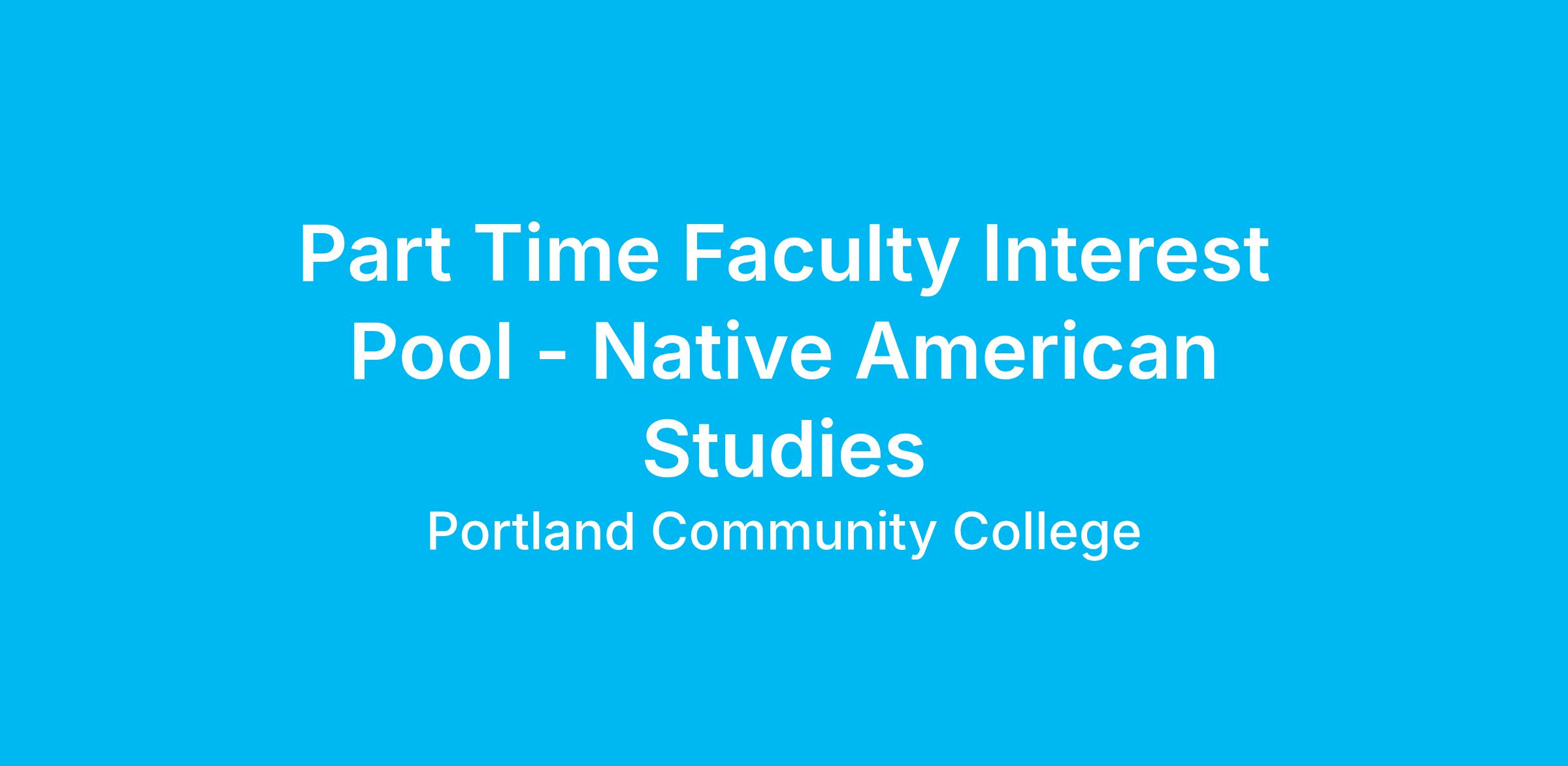 Portland Community College is accepting applications to be considered for Part-Time Faculty assignments in Native American Studies. The Department will review applications in this pool as the need arises for new part-time faculty in this area.Learn more about our program here https://www.pcc.edu/instructor-qualifications/nas-native-american-studies/